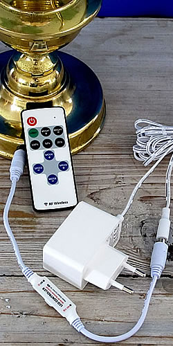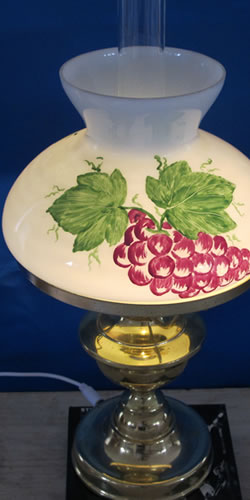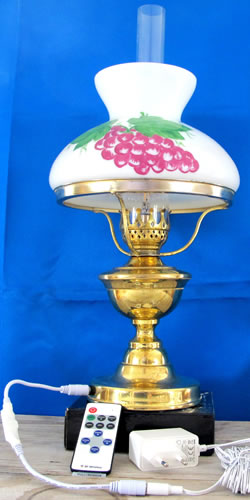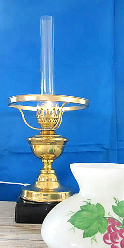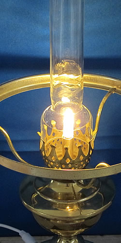 Ein „Hingucker“ zwar, aber keine alte Lampe. Die jetzige 12-Volt-Zuleitung folgt der früheren 220 V-Kabelführung durch den Fuß des Messing-Lampenkörpers. Das wäre bei Original-Lampen wegen des Petroleumtanks aus Glas nicht möglich.