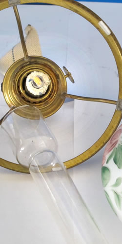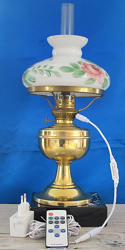 Eine echte Petroleumlampe wurde zu einer fernsteuerbaren LED-Leuchte umgebaut. Zu sehen ist der 12 V-Netzstecker-Trafo, der kleine, schmale Dimmer und die praktische Fernbedienung. Mit ihr kann die Helligkeit mehrstufig (10, 20, 40, 60, 80, 100%) eingestellt werden.