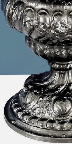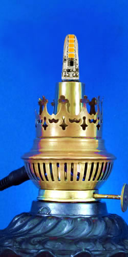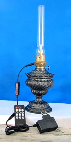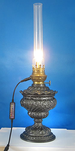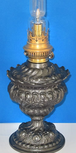 Diese typische Petroleumlampe mit einem reich dekorierten Lampenkörper aus Zinkdruckguss ist sicher über 130 Jahre alt.