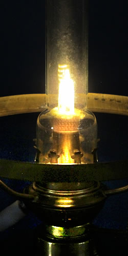 Ein überzeugendes Beispiel einer "schummerig" leuchtenden Petroleumlampe im dunklen Zimmer. Die Dimmerstufe ist hier für das Foto auf 10% eingestellt.